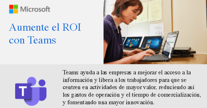 Teams ayuda a las empresas a mejorar el acceso a la información y libera a los trabajadores para que se centren en actividades de mayor valor, reduciendo así los gastos de operación y el tiempo de comercialización, y fomentando una mayor innovación.