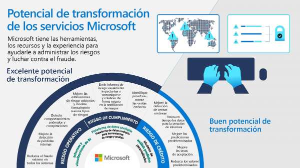 Microsoft tiene las herramientas, los recursos y la experiencia para ayudarle a su empresa a administrar el riesgo financiero y, al mismo tiempo, luchar contra el fraude. Esta infografía representa visualmente las potenciales vulnerabilidades y explica cómo la detección de fraudes permite eliminarlas.