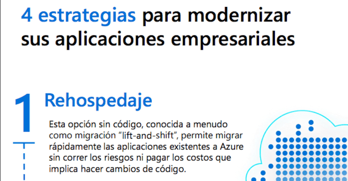 Esta infografía describe las cuatro estrategias diferentes disponibles para migrar sus aplicaciones a Microsoft: reorganizar, reconsiderar, rediseñar o reconstruir.