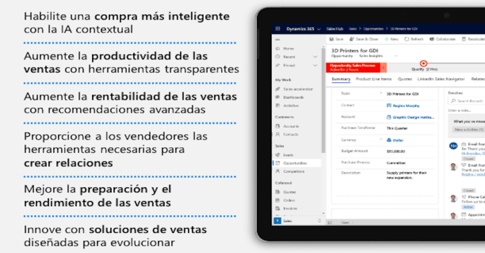 Vaya más allá de las transacciones e interacciones para dar a sus compradores experiencias únicas que generen confianza. Transforme la experiencia de ventas con Dynamics 365 Sales. Las características incluyen permitir ventas más inteligentes con AI contextual, aumentar las ventas de manera rentable con recomendaciones avanzadas y mejorar el entrenamiento y el rendimiento de las ventas.