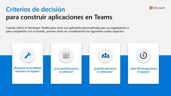 Esta infografía muestra los criterios de decisión para la creación de aplicaciones en Teams utilizando el Developer Toolkit. Antes de desarrollarlo, pregúntese: ¿Resuelve un problema real? ¿Con qué frecuencia se utilizará? ¿Cuántas personas la utilizarán? ¿Qué ROI proporciona? Y una vez que decida avanzar y crear su aplicación, vea cómo ampliar su alcance con AppSource.
