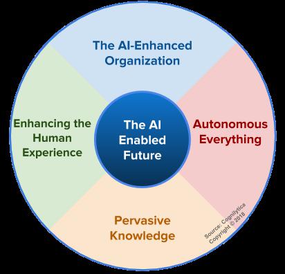 En este artículo de Forbes se explora la visión del futuro de la AI de Cognilytica, la cual consta de cuatro partes Bajo esa visión, hay cuatro áreas principales en las que la AI tendrá un impacto en nuestras vidas futuras: la forma en que trabajamos, vivimos y experimentamos el mundo, y nuestras interacciones con los demás, y la relación que tenemos con los datos.