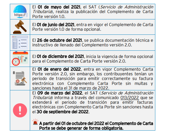 Entrada en vigor del Complemento de Carta Porte Publicado el 9 marzo, 20229 marzo, 2022 por cadesoluciones Através del siguiente comunicado te informamos de los cambios de entrada en vigor quese han tenido para el Complemento de Carta Porte. Comparte ahora! Haz clic para compartir en X (Se abre en una ventana nueva) X Haz clic para compartir en Facebook (Se abre en una ventana nueva) Facebook Me gusta Cargando... Relacionado Publicado por cadesoluciones Te ayudamos con la adopción de soluciones de negocio basados en tecnología, como SiigoAspel, Microsoft 365, UKG, Intelisis, Kaspersky, Azurey Surface. Expertos en soluciones en la nube Ver todas las entradas de cadesoluciones