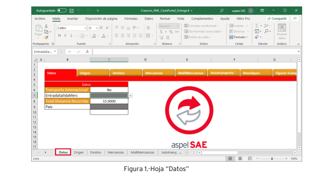Veamos cada una de las hojas: a) Hoja “Datos”: Indica si el transporte es internacional, la entrada o salida de la mercancía y el País. El campo “Total Distancia Recorrida” se autocompleta con los datos indicados más adelante.