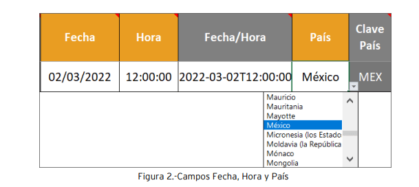 Recuerda que si el RFC es extranjero se deberá de incorporar los datos de: Número de identificación fiscal, Residencia Fiscal y Clave Residencia Fiscal. • Los campos “Fecha” y “Hora” se deberán especificar, al colocar estos datos en el archivo se auto completa el campo “Fecha/Hora”. Al igual que en “País” (este cuenta con una lista desplegable, en el cual se podrá indicar el país, este dato se vera reflejado en el campo siguiente).
