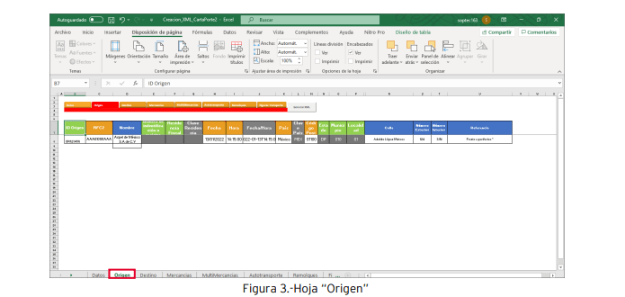 Hoja “Origen”: • ID origen: Este campo se conforma de dos letras las cuales son “OR” (indicando origen), seguido de 6 dígitos los cuales se recomienda colocar una numeración consecutiva. Es importante mencionar que el archivo solo permite indicar un lugar de origen.