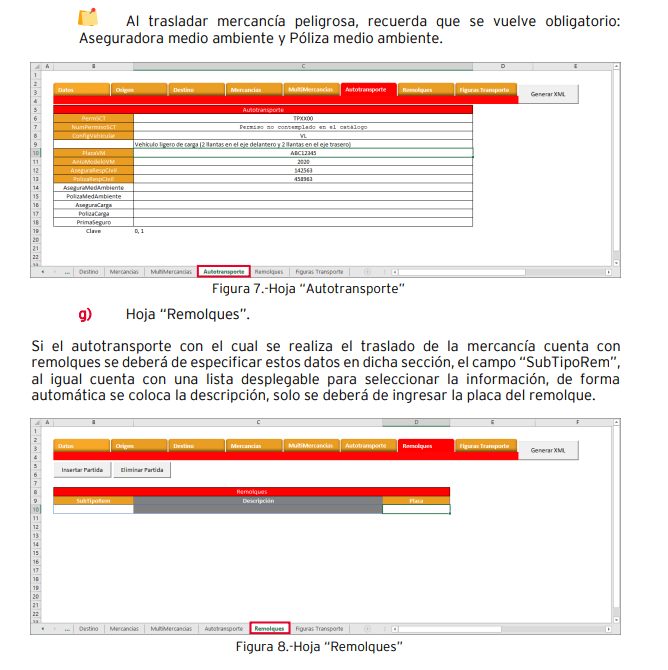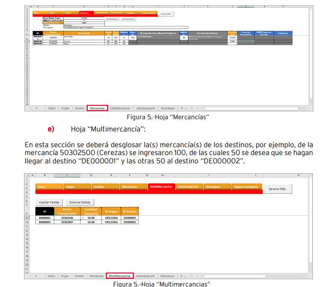 Hoja “Mercancías”: • “Peso Bruto Total” y “Número total de mercancías”: El libro de Microsoft Excel, realiza la sumatoria en automático por lo que no se deberá modificar estos campos. • Unidad de peso: Indica la unidad de peso de las mercancías a trasladar, este cuenta con una lista desplegable para indicar el peso (esto de acuerdo con el catálogo del SAT). • ID: Está compuesto por dígitos alfanuméricos, se recomienda dejar la estructura que coloca el archivo, ya que este indica un consecutivo con el cual se identifican las partidas que se están agregando (mercancías o productos a transportar). • Bienes transportados: Coloca la clave SAT de la mercancía o producto a transportar, con este dato se podrá saber si el material es peligroso o no y se colocará la información en dicho campo (de igual manera de acuerdo con el catálogo del SAT). • Descripción y Cantidad: Ingresa la descripción y cantidad del producto o mercancía a transportar. • Clave Unidad: Cuenta con una lista desplegable para poder seleccionar la clave unidad.