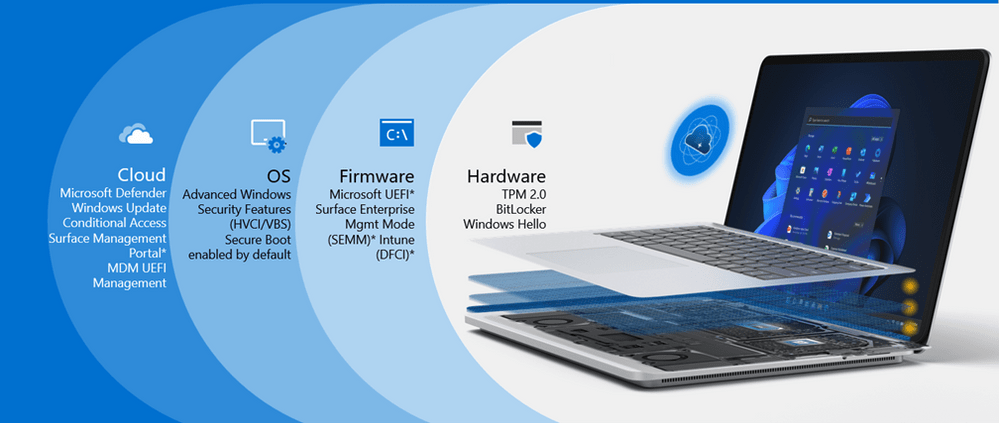 Microsoft mantiene cada capa de Surface, desde el chip hasta la nube, lo que le brinda el máximo control, protección proactiva y tranquilidad donde y como se realice el trabajo.2