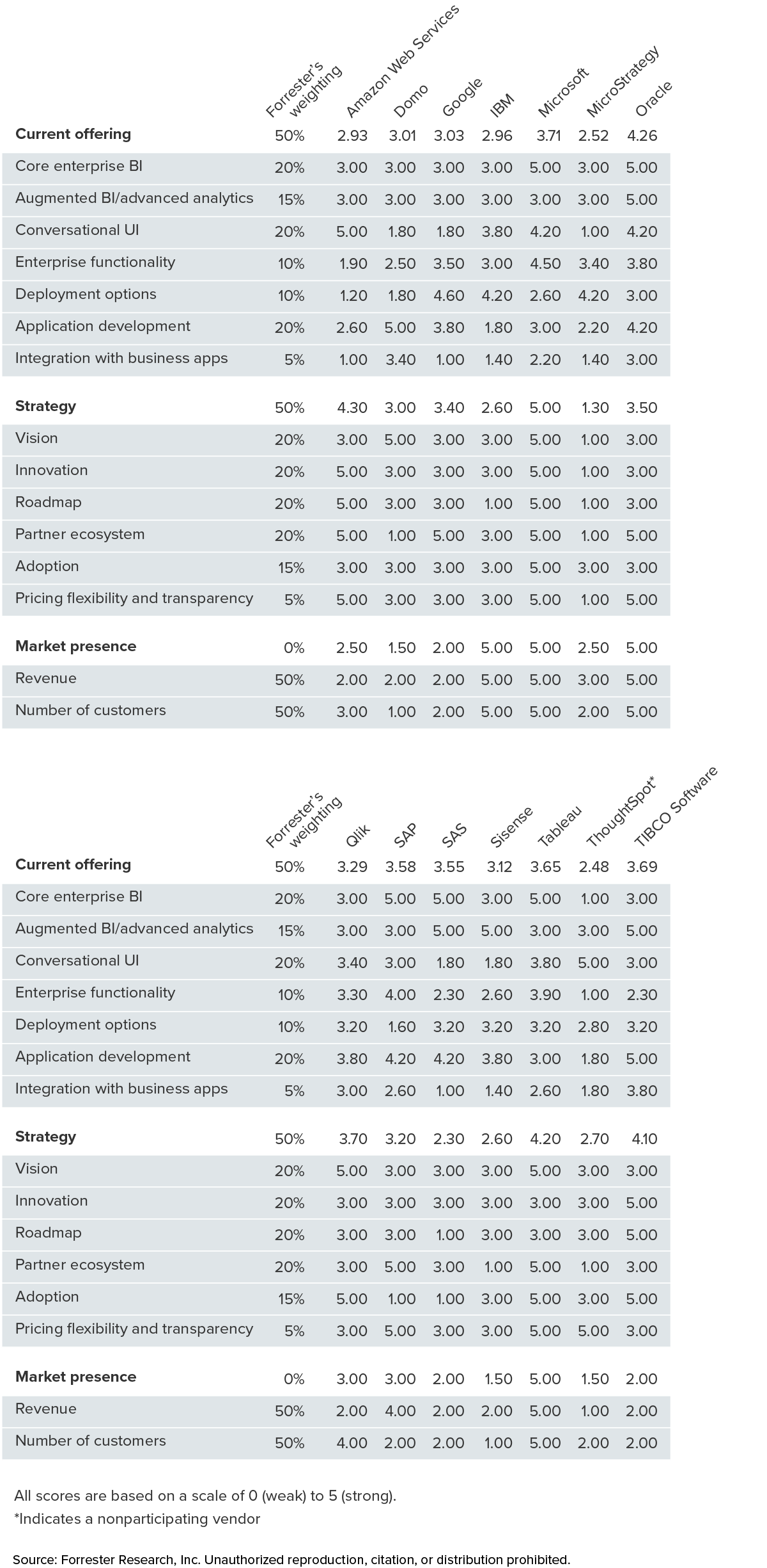 - Oferta actual. La posición de cada proveedor en el eje vertical del gráfico Forrester Wave indica la fortaleza de su oferta actual. Los criterios clave para estas soluciones incluyen BI empresarial central, BI aumentado/análisis avanzado, interfaz de usuario conversacional, funcionalidad empresarial, opciones de implementación, desarrollo de aplicaciones e integración con aplicaciones empresariales.