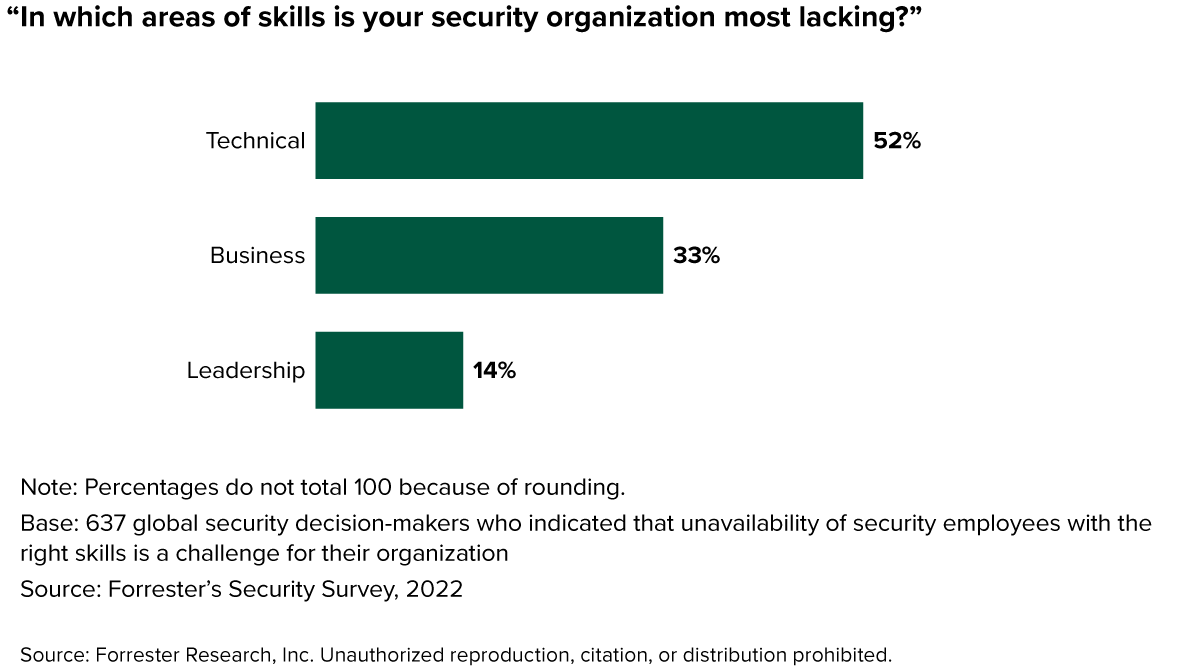 Esta estructura también conduce a la promoción por certificación, lo que obliga a los analistas a gastar dinero y estudiar para las pruebas fuera del horario laboral para llegar al siguiente paso en su carrera, lo que aumenta su falta de satisfacción y conexión con la organización. Los empleados que no pueden crecer en su organización se irán a otras empresas o proveedores de seguridad o abandonarán la industria por completo. - Priorice el dominio del producto por encima de los principios básicos de seguridad. Según los datos de Forrester de 2022, de los responsables de la toma de decisiones de seguridad global que indicaron que la falta de disponibilidad de empleados de seguridad con las habilidades adecuadas era un desafío para su organización, el 52% señaló que su organización de seguridad carece más de habilidades técnicas (ver Figura 1). Incluso aquellos que tienen las habilidades técnicas a menudo se capacitan en productos, no en principios. Se les entrena para usar Splunk, CrowdStrike o QRadar, pero rara vez se les capacita sobre cómo crear detecciones, investigar y responder a incidentes de seguridad, lo que con frecuencia es conocimiento tribal. El sucio secreto del SOC es que esperamos que el talento de nivel inicial (analistas de seguridad) practique los principios de seguridad sin enseñarles nunca qué son o cómo hacerlo.