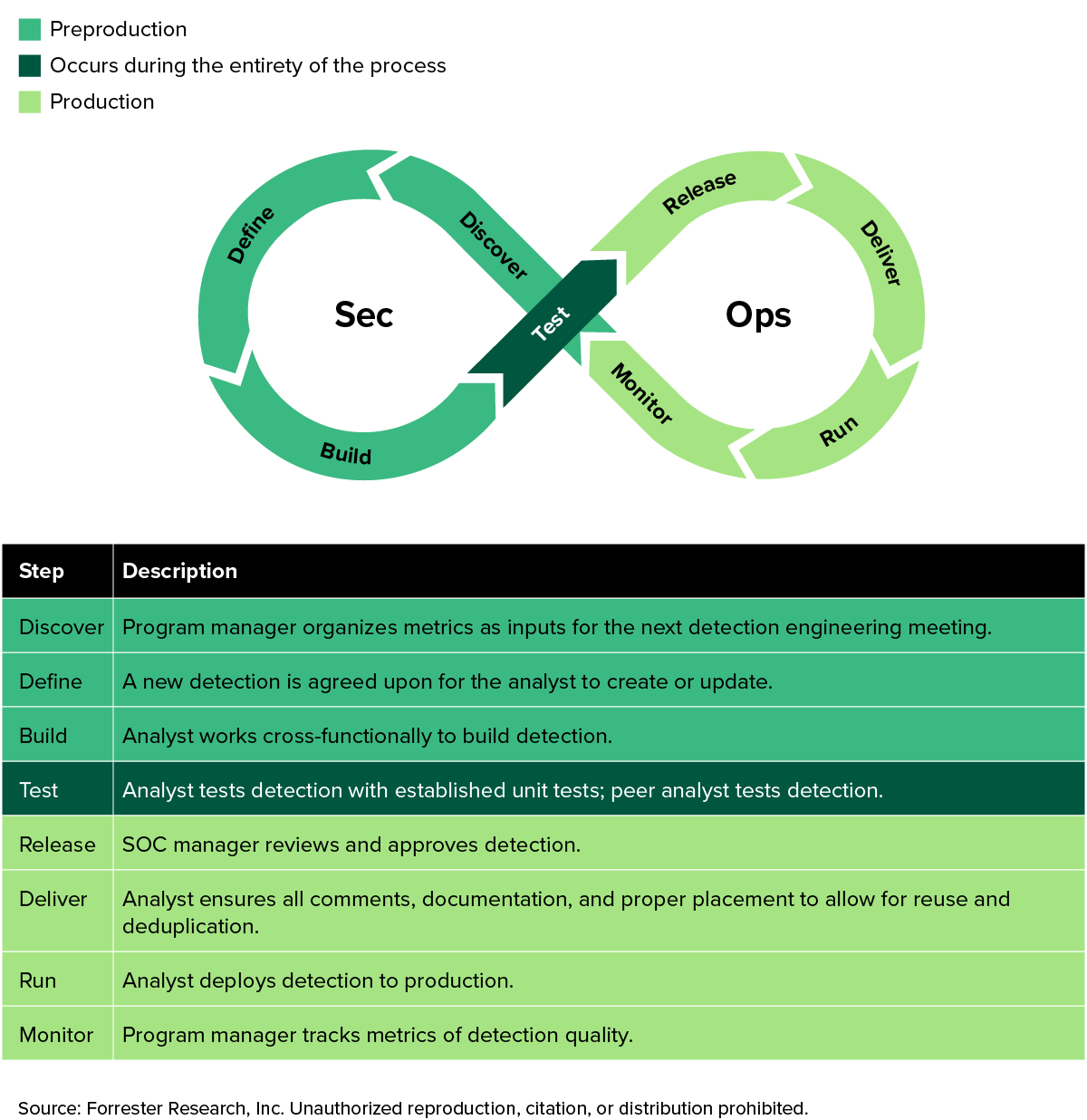 Según Keith McCammon, director de seguridad de Red Canary: «Concéntrese primero en la detección y la respuesta. Ponga en práctica la inteligencia de amenazas a través de la detección basada en ingeniería que es repetible, escalable y comprobable. Las pruebas son fundamentales y, a menudo, se pasan por alto: debe probar y medir todo lo que pueda, desde su canalización de datos hasta la respuesta de su equipo». Este marco ayuda a su equipo a establecer un proceso de compilación coherente y oportuno que incorpore la ideación, el diseño, la compilación, las pruebas, la versión y la supervisión continua.