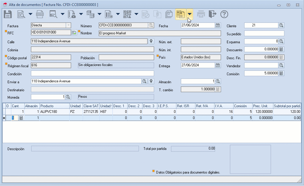Ahora observa los productos capturados en las partidas del documento, sin posibilidad de agregar o eliminar más registros.