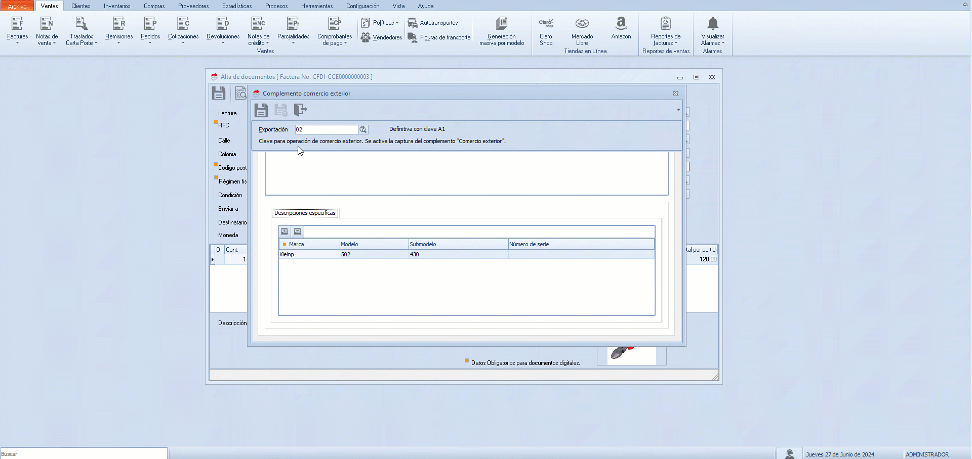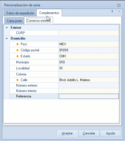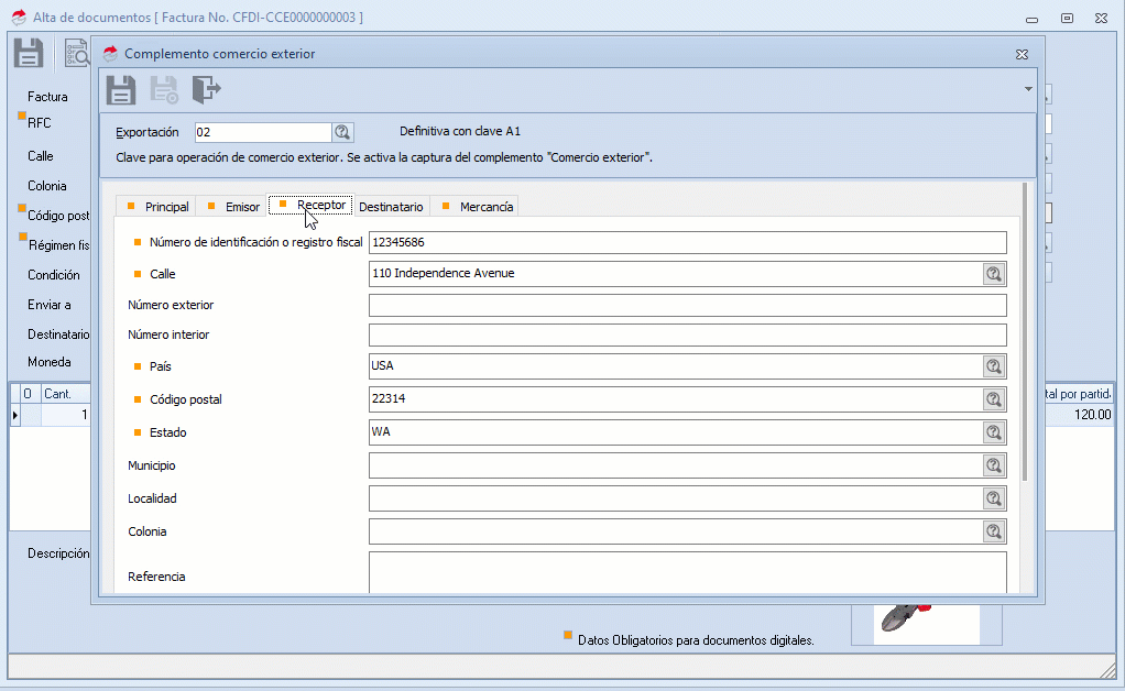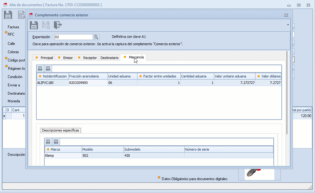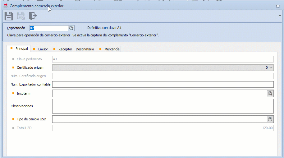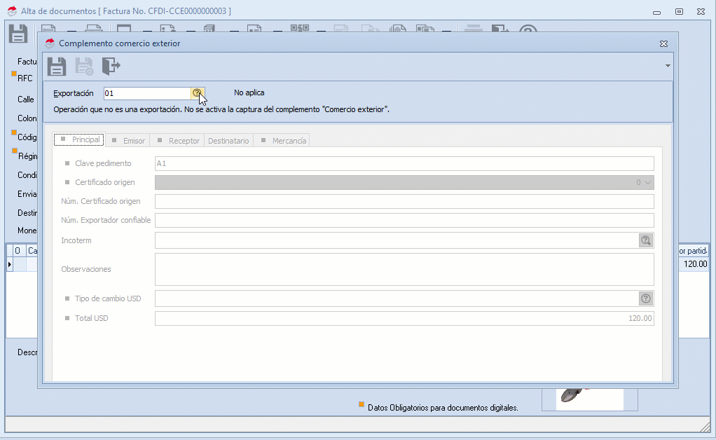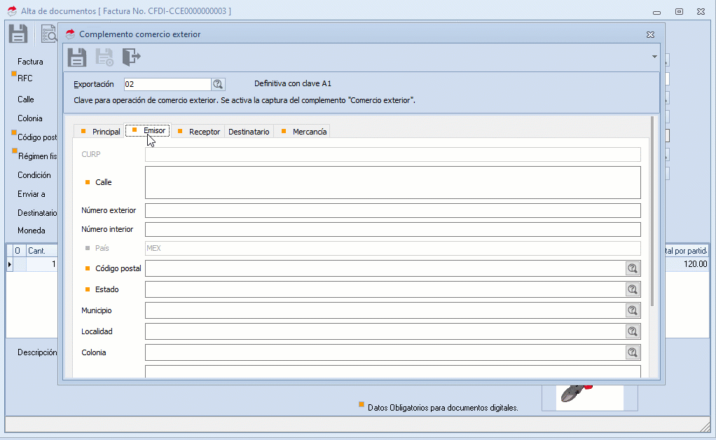 b. Se despliega la ventana donde capturas los datos del complemento de Comercio Exterior, en cada sección:
