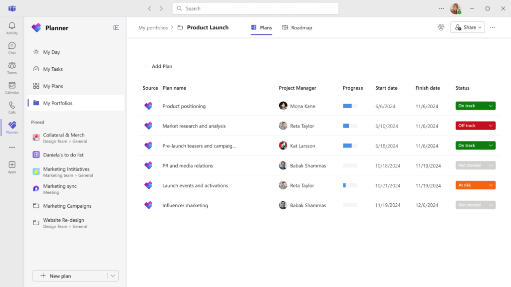 Ya sea coordinando entre varios equipos o buscando una perspectiva de arriba hacia abajo de varios planes, la característica Portafolios de la aplicación Planner en Teams lo hace todo posible en un solo lugar, lo que agiliza los flujos de trabajo y mejora la colaboración