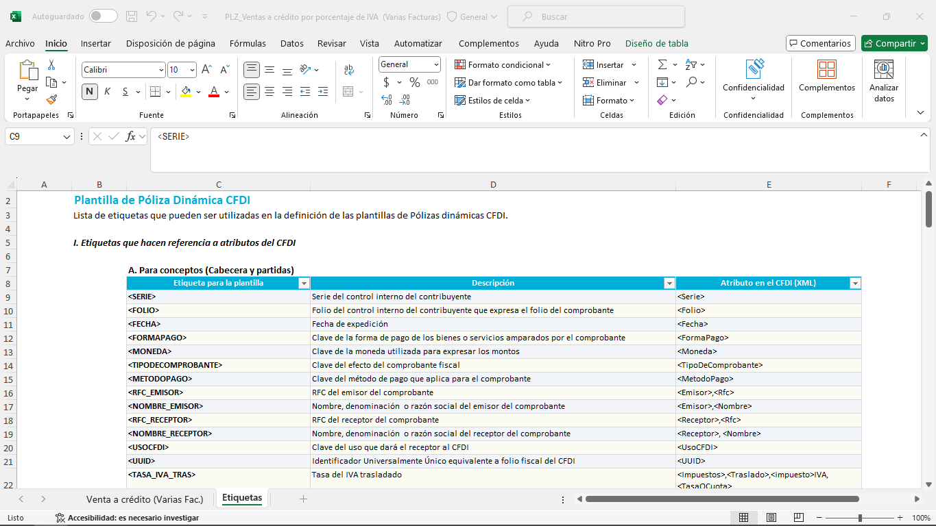 Las plantillas funcionan con etiquetas como <FECHA>, <TOTAL>, etc. Puedes verlas al editar la plantilla en excel, en la pestaña Etiquetas.