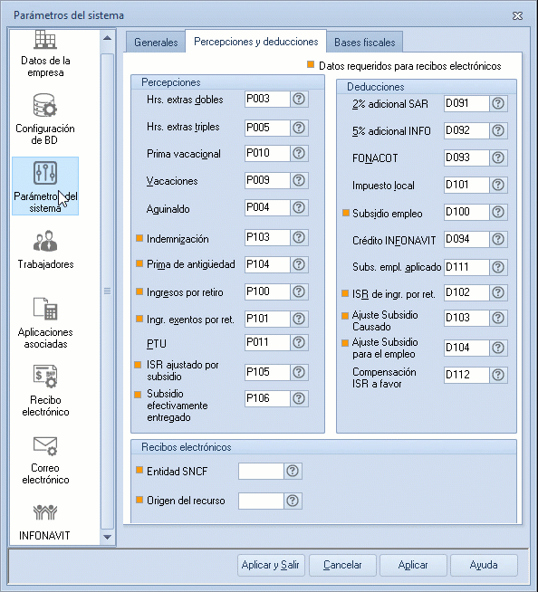 - En la ventana que se despliega seleccionas el ícono Parámetros del sistema, te diriges a la pestaña Percepciones y deducciones y localizas el campo Compensación de ISR a favor.