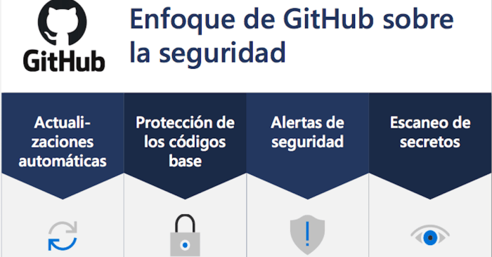 En GitHub, los equipos trabajan juntos para asegurar el software del mundo en cada paso. Esta infografía destaca los cuatro pilares del enfoque de seguridad de GitHub.