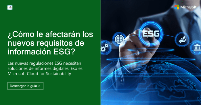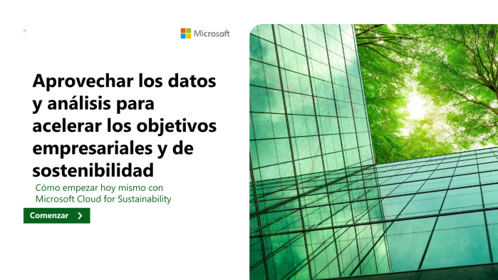 Descubra dónde la tecnología se une a la responsabilidad medioambiental en nuestro eBook: "Aceleración de los negocios sostenibles: Aprovechar los datos y la IA para cumplir con los objetivos empresariales y de sostenibilidad". Esta guía explora el rol vital de una sólida base de datos en la consecución de los objetivos de sostenibilidad y explica cómo podemos ayudarle a aprovechar el potente soporte que proporciona Microsoft Cloud for Sustainability.